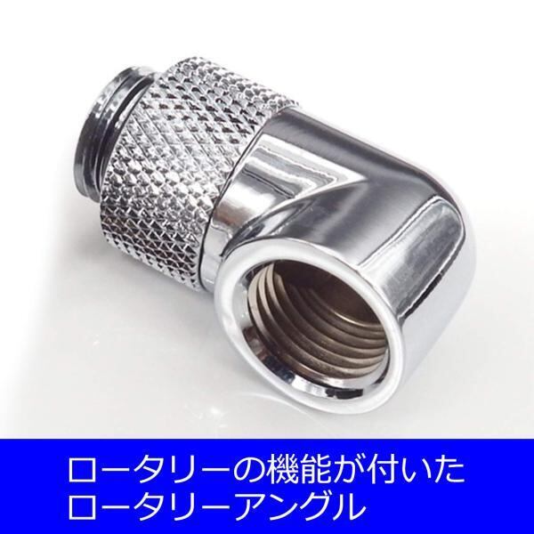 アングル、フィッティングと呼ばれるパーツであり、こちらの商品はロータリーの機能が付いたロータリーアングルになります。90度の角度がついたフィッティングになるため、チューブを繋ぎやすく調整いただくことができます。ニッケルメッキ採用で汚れに強い仕様です。