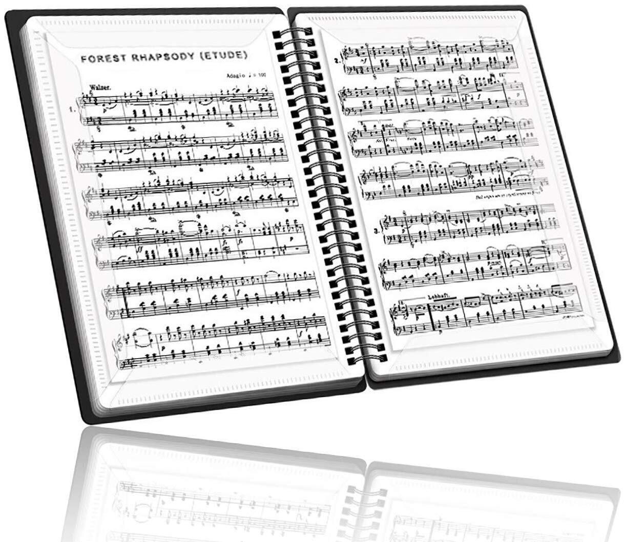 コンクールのステージの光や、照明や日の光などが当たって楽譜が見えにくくなったことはないでしょうか。この譜面ホルダーは端の部分だけを固定する楽譜バインダーファイルで、照明の光の反射を防ぐことができ、光に照らされた状態でも楽譜が見やすいデザインになっています。